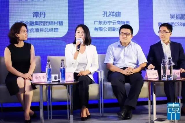 △ 谭丹在“企业社会责任:挑战与机遇”主题演讲环节发表了关于“时代楷模”黄大发老支书“当代愚公”精神的演讲,并讲述了中天金融集团“点梦成金”遵义团结村产融扶贫项目精准扶贫方案